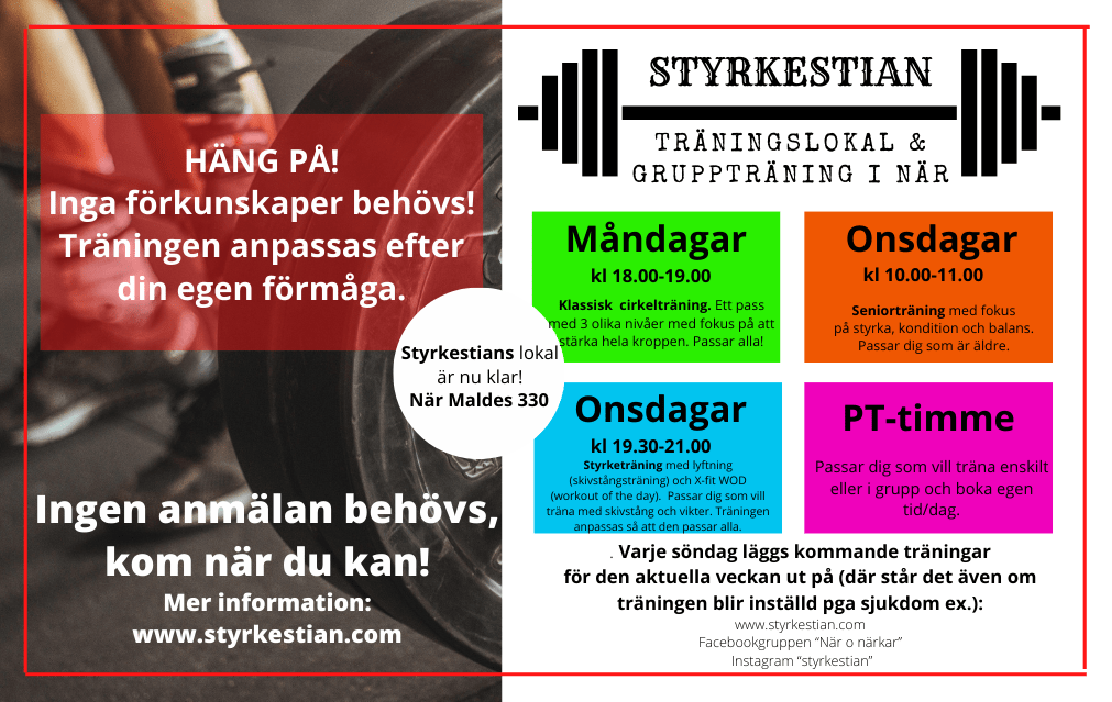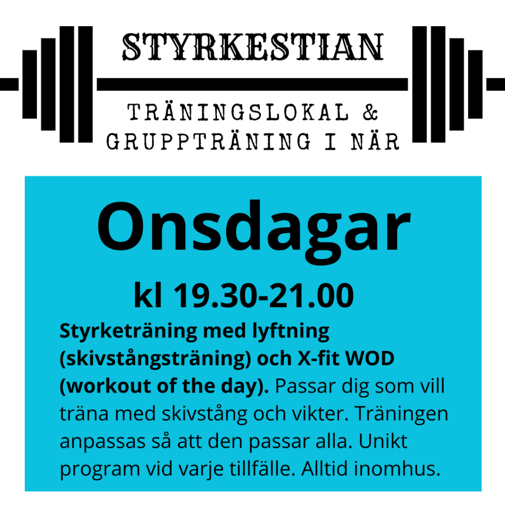 Styrkestian är öppen för alla! Det går alltså träna i gymmet på egen hand. Du får en kod till dörren vilket gör att du kan träna på de tider du önskar förutsatt att lokalen inte är bokad av någon annan. Träna helt själv, utan att någon annan är där. Vid varje bokning har du lokalen helt själv i 1,5 timme! Du skickar sms där du skriver vilken dag och tid du vill boka, 0737348490.