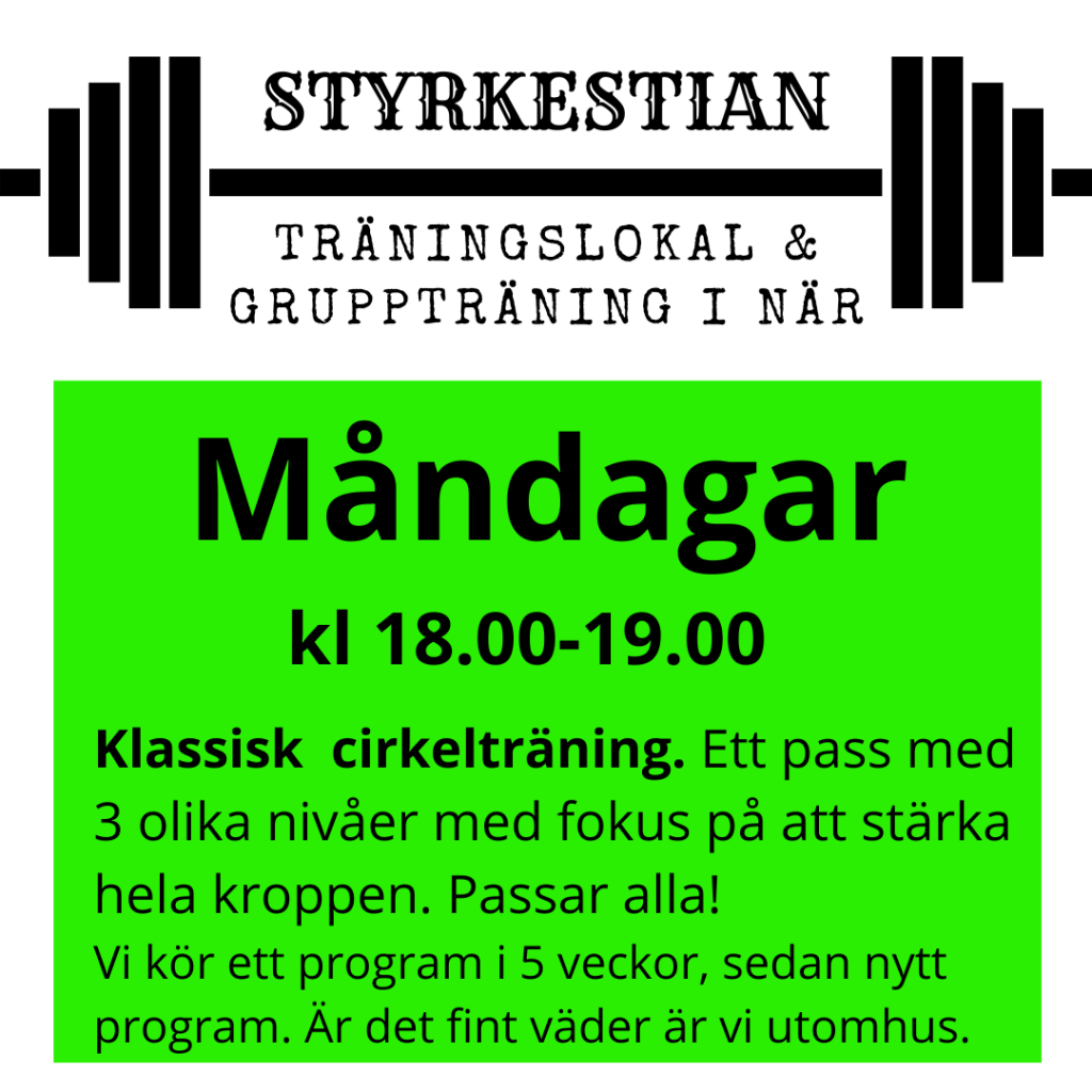 Styrkestian erbjuder även gruppass. 3 gruppass i veckan. Måndagar kl 18.00 cirkelträning, onsdagar kl 10.00 seniorträning och onsdagar kl 19.30 lyftning & X-fit.